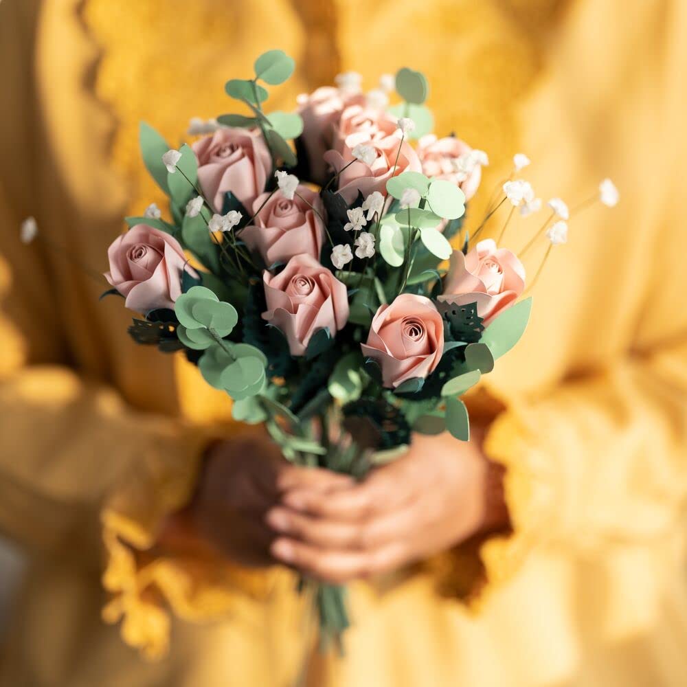 - EVERLASTING PAPER BOUQUET: These long lasting artificial flowers are sure to wow: pink paper roses are mixed with baby’s breath and vibrant green leaves to create a stunning pop-up bouquet and there’s no watering or wilting!